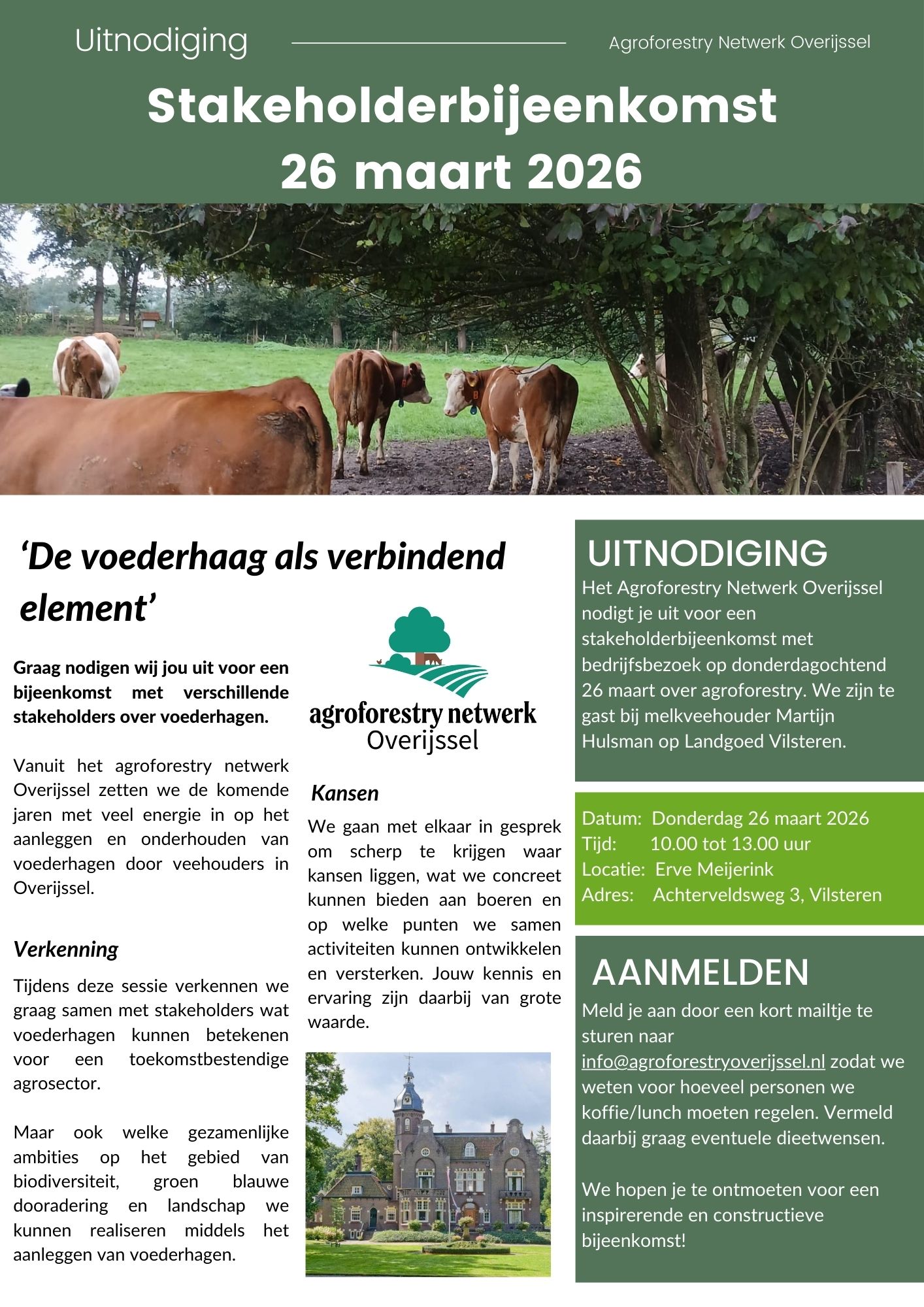 Het Agroforestry Netwerk Overijssel nodigt je uit voor een stakeholderbijeenkomst met bedrijfsbezoek op donderdagochtend 26 maart over agroforestry. We zijn te gast bij melkveehouder Martijn Hulsman op Landgoed Vilsteren.